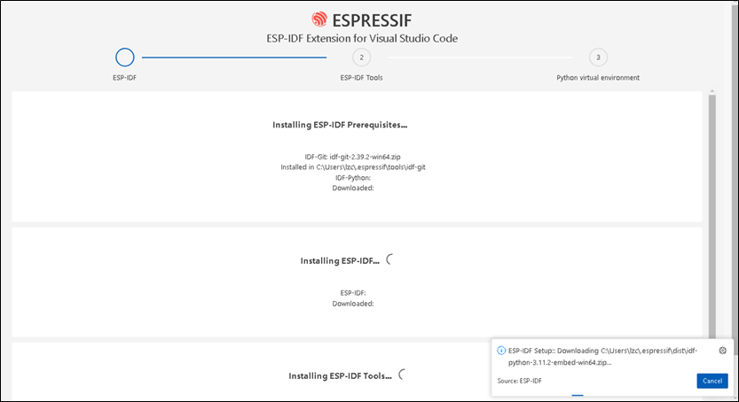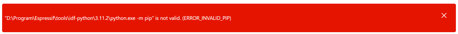如果在安装的过程中报错"c:\Espressif\tools\idf-python\3.11.2\python.exe -m pip" is not valid. (ERROR_INVALID_PIP), 则去 esp-idf 的安装目录 c:\Espressif\tools, 把 idf-python 目录删除, 然后再点Install 重新安装即可。