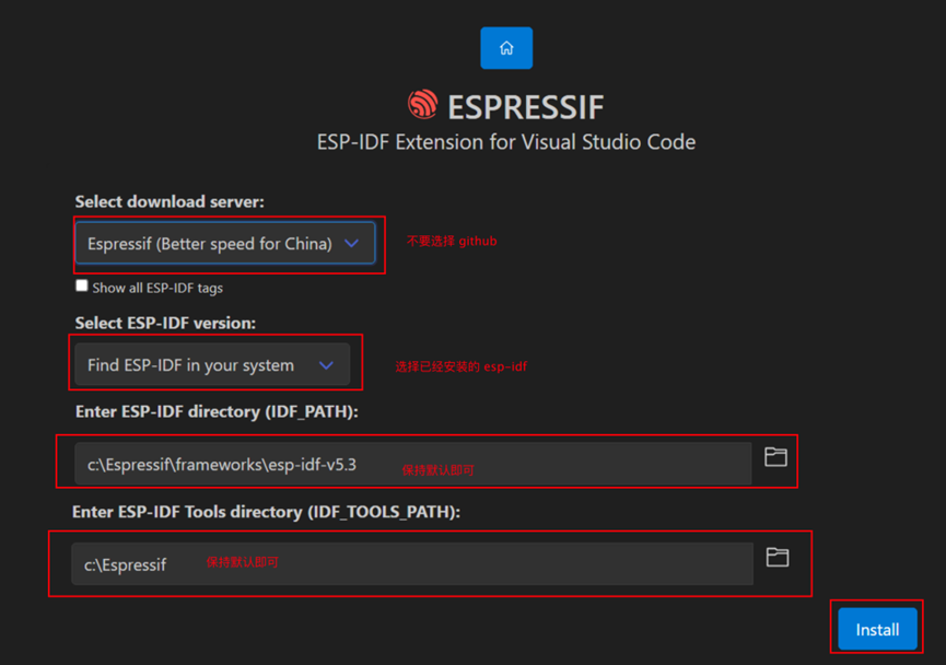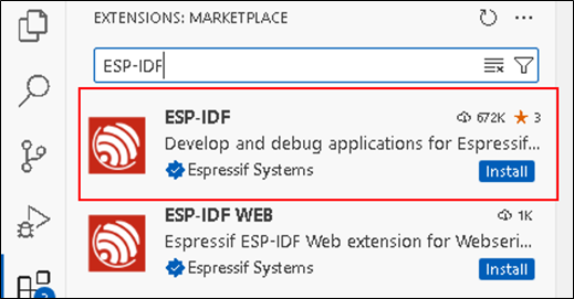在vscode插件市场搜索ESP-IDF, 然后点击Install安装插件