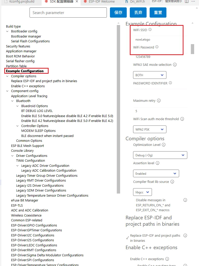 the config you want - ie #define EXAMPLE_WIFI_SSID "mywifissid"